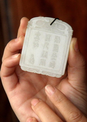 近日,“陸子岡玉雕藝術與中國玉文化研討會”在蘇州舉行。200余位學者和玉雕藝人參加了“中國玉文化發展階段與典型特征”、“東亞最古老的玉器”等玉文化主題研討。陸子岡是我國明代知名玉雕家,其現今傳世作品主要被收藏在故宮博物院、首都博物館等地。圖為“子岡款”詩文牌飾。