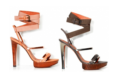 Lanvin 2012春夏鞋履系列堪稱性感中不失質感的大氣之作。尖頭、超高跟、防水臺的鞋子,采用了木質的防水臺,并在鞋跟上做了適當的點綴來滿足整雙鞋的造型需求。鞋面綴滿鉆飾的高跟鞋在鞋跟上也做了相應的處理;裸色的涼鞋的鞋跟和防水臺統一采用了較深的色彩來壓住鞋子的重心。多種彩色蟒蛇紋的應用都性感十足。