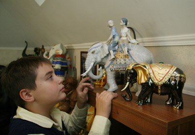 圖為大象迷菲莫維奇的兒子在家里擺弄收藏的大象工藝品。新華社發