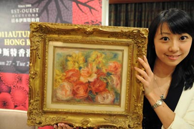 圖為模特展示皮埃爾·奧古斯特·雷諾阿的油畫《薔薇圖》(23×28cm),估價200萬至300萬港元。
