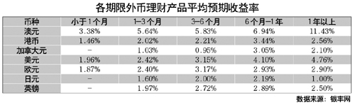 相比之下,外幣理財產品的優勢明顯,預期收益率較定存高。不過,外幣理財的劣勢在于其投資門檻比較高。一般來說,美元理財產品投資金額為8000美元,澳元理財產品投資金額為8000澳元,港幣理財產品投資金額為6萬港幣;投資者不能提前贖回,或者投資者提前贖回會出現本金及收益損失的風險。另外,外幣理財產品風險相對于外幣定存來說風險較高。