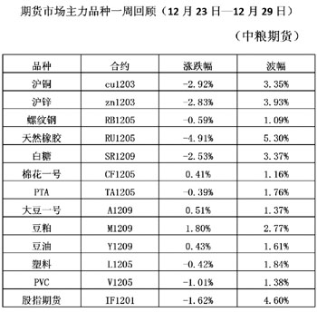 下周各品種走勢預計如下:CU1203在53500一線有一定支撐;ZN1203在14200-14400有一定支撐;RB1205在4100一線有一定支撐;RU1205在24000一線有一定支撐;L1205在9200-9300有一定支撐;PVC1205在6700-6750有一定支撐;TA1205在8100一線有一定支撐;SR1209在6000一線有一定支撐;CF1205將在20750一線形成底部,下周有上漲至21000-21200可能;CBOT美豆未來有走高至1300一線可能;A1209在4300一線有一定支撐,未來有走高至4600一線可能;M1209在2900一線有一定支撐,未來有走高至3200一線可能;Y1209在8800一線有一定支撐,下周有上漲至9000-9200可能,未來仍有走高至9500-9600可能。