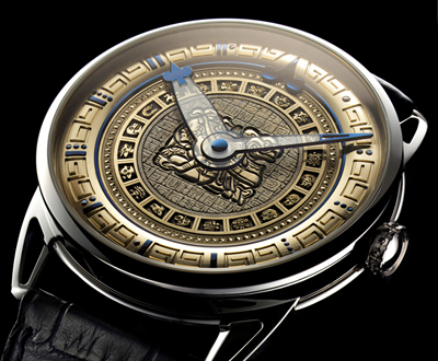 Rothen手工凋刻而成,并嵌入31藍鋼令表盤。小時圈顯示瑪雅數字系統的數字,而內圈則顯示了代表瑪雅日歷中每個周期20天的20個神靈、動物和圣物的圖像字符。