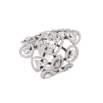 全新頂級珠寶系列將這個精髓發揮至極,種種對比元素自由地奇妙組合,帶來無以言喻的視覺沖擊:既形象生動又感性魅惑,既有強烈的結構感又流動變幻。色彩的運用同樣大膽,出其不意地打破色調的平衡,卻由此締造獨一無二的和諧。圓形和不規則幾何形隨性碰撞,光影迭映,交織出如夢如幻的協調韻律。