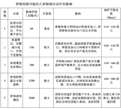 此外,對于伊朗局勢可能的幾種情境,我們做出以下歸類(見下表)。其中情境1、2和3之間的跨度較大,而在情境3下,伊朗遭受全面制裁后到情境4和5的演變將會較為迅速。一旦伊朗爆發戰事,將會引發中東原油生產的全面停滯。從目前事態的發展來看,仍處于情境1的預期之下,我們預計在7月歐洲正式對伊朗實施禁運之后,有可能發展為情境2,而發展至情境3的可能性極小。因此,就伊朗局勢的影響而言,我們預計,在一季度、二季度偏中性,而在三季度之后將對油價產生一定推動。
