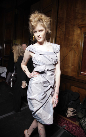 雖然以灰、藍、紫、駝色為主色調的本季時裝與韋斯特伍德過去的設計相比較為暗沉,但與原生態的民族風格圖案搭配起來更顯自然。不甘寂寞的韋斯特伍德還在其中穿插了飽滿的橙色針織衫、絲巾和酒紅色連褲襪,為寒冷的秋冬季節帶來一絲暖意。