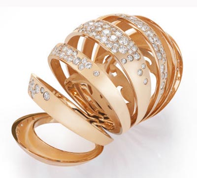 今年巴塞爾高級鐘表珠寶展上,deGRISOGONO推出了神秘莫測的JIYA(印度語:甜蜜、靈魂)系列戒指:每一枚JIYA都由七枚妖嬈性感的指環共同組成,象征著品牌創始人及總裁FawazGruosi先生的幸運數字七。JIYA既可以作為一個整體,如一個來自異域的精靈般依附指間;也可以化為七個底部彼此相連的環形飾物,宛若綻放的印度紅蓮。又一次,deGRISOGONO旗下的頂級珠寶工藝師團隊,以無以復加的耐心和近乎嚴苛的工藝水準,將FawazGruosi大膽創意化為指尖可觸碰的奢華與精致。