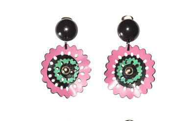 大膽而出人意料是Marni 2012夏季系列首飾的一大特色。設計師利用回收塑料和聚乙烯樹脂組合而成華麗花狀飾物,穿孔樹脂呈現桑加羅蕾絲般的效果。耳環上的吊墜由幾何形狀的樹脂制成。以黑色為基底色,加以適當的熒光色點綴,讓每件首飾都足夠靚眼。