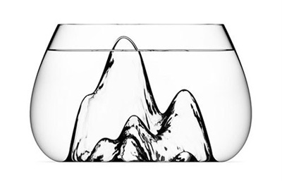 Fishbowl的魚缸在土耳其手工吹制而成,構造新穎,設計師運用玻璃可以任意塑形的特性,將魚缸的本來水平的底部制成山峰的形狀,營造一種山脈凸起的視覺效果。在充滿水之后,光線的折射會帶給人一種水墨山水畫的意境。而若在其中放入金魚,又會有一種萬花叢中一點紅的感覺,同時一動一靜的結合亦將濃郁的中國風情調擴散而出。