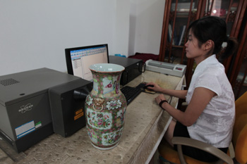 工作人員在用脫;Y構分析法對瓷器的年代進行數據分析!懊摬;蓖ㄟ^對瓷器釉面微觀物質結構的測試可以確定釉質結構變化的程度、推測釉質最后燒成的年代,以此來判斷器物的年代。記者