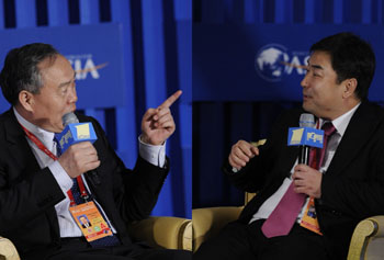 4月3日,中國國際經濟交流中心常務副理事長鄭立新(左)、長江商學院副院長劉勁在辯論會上(拼版照片)。 當日,博鰲亞洲論壇舉行電視辯論,嘉賓們圍繞“2012中國房地產大變革”這一議題展開討論。記者