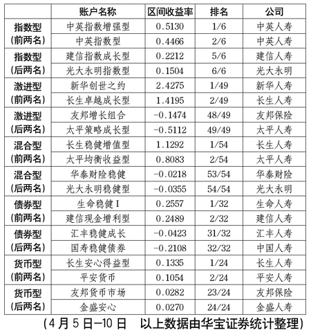 據華寶證券統計,本月的前4個交易日(4月5日至10日),投連險各分類賬戶中,與股票市場相關性較強的指數型、激進型賬戶普遍取得正收益,但是指數型賬戶表現不及激進型,也跑輸大盤,兩者均未能較好的把握本周的行情,債券型、貨幣型賬戶收益率依舊穩健。