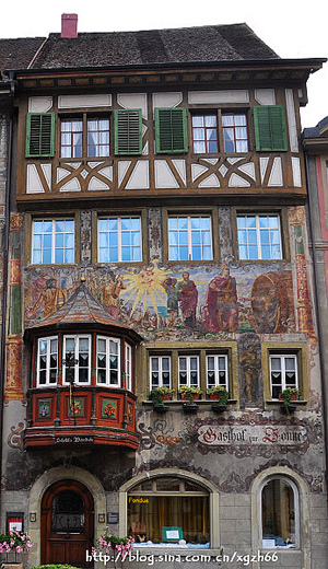 確切地說,施泰因不能叫做城市,充其量是個小鎮,這里的常住人口只有3000人。從面積上看,小鎮長400多米、寬只有200多米,很小的范圍,但濃縮的的確都是精華。街巷里,到處是中世紀的老建筑,每家每戶的窗口,都擺放著五顏六色的鮮花。最令人目不暇接的,是建筑外立面上的濕壁畫(Fresco),雖然這些壁畫大部分產生于上世紀初。