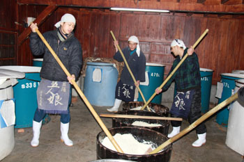 工作人員手持的長竹竿前固定有一塊厚木塊,這就是攪拌的工具。而制作酒母的最大看點就是工作人員一邊攪拌一邊唱《釀酒歌》。歌曲長達13段,“利根川水源流長,清泉涌出釀瓊漿……”吉慶的歌詞讓煩躁單調的工作充滿樂趣,還有一個功效是可以用歌曲來估算攪拌的時間,真正將勞動與藝術結合在一起。隨著不斷攪拌,大木盆內的蒸米飯、酒曲結合在一起,變成了黏糊狀。