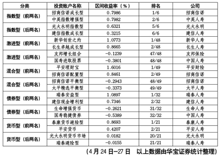 華寶證券統計,4月24日-4月27日,大部分投連險賬戶延續上揚趨勢,整體取得0.33%的平均收益,其中91.7%的賬戶實現正收益。但仍有國壽進取股票、友邦增長組合等多個賬戶以區間負收益的表現在各類型投連險賬戶中墊底。