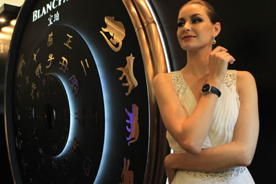寶珀近日在北京舉行新聞發布會,正式發布全球首款“中華年歷腕表”,該款腕表研發歷時5年,表上鑲有39枚寶石,擁有430余個部件的新型自動上鏈復雜機械機芯,將西方傳統太陽歷法與中國農歷相結合。圖為模特在中華年歷腕表模型旁展示寶珀出品的腕表。