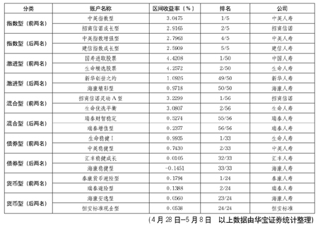 華寶證券統計,4月27日-5月8日,投連險各賬戶跟隨市場穩步上漲,整體取得1.42%的平均收益。絕大部分賬戶實現正收益。
