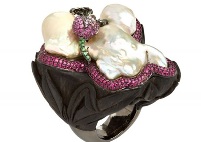 花朵戒指:18ct白金戒指,寶石與珍珠完美結合的典范,石榴紅色的寶石搭配綠色寶石惟妙惟肖地體現出了花朵的造型。