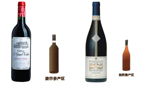 由于波爾多地區的釀酒者習慣于釀制可儲藏多年的葡萄酒,因此他們使用的酒瓶顏色越來越深(光線是儲酒的最大敵人);而勃根地地區的酒不用儲存很久便可飲用,所以酒瓶通常為淺綠色。