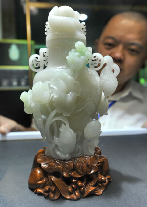 第八屆湖南珠寶玉石收藏工藝品展日前在位于長沙市的湖南省展覽館開展。據了解,本次展會展出面積達20000平方米,有來自國內外的600多家企業參加,共展出珠寶、收藏展品10萬余件。圖為湖南珠寶玉石展上展出的一件玉石雕刻件。