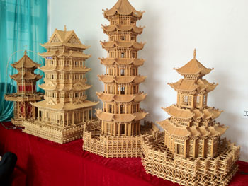 走進徐老漢家的客廳,里面儼然一個中國古代著名建筑微型展覽室,故宮角樓、天安門城樓、滕王閣、黃鶴樓等,老人說,這些古代建筑他只要能夠到現場看上幾眼,就能用高粱稈扎刻出來。