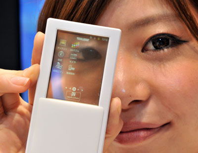 在日本東京舉行的電子通訊展上,一名模特展示NTT DoCoMo公司推出的透明觸屏智能概念手機。這款智能手機配備有一個2.4英寸的透明觸摸屏,使用者可以從正反兩面使用。