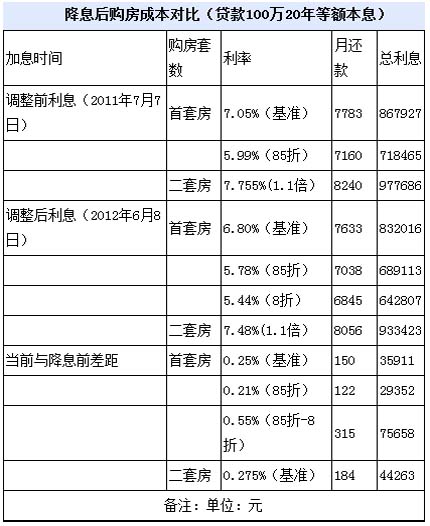 首套房100萬元20年期的房貸月供將可省下150元了。中國人民銀行于6月7日晚間宣布,自2012年6月8日起,將金融機構一年期貸款基準利率下調0.25個百分點。此外,央行同時將金融機構貸款利率浮動區間的下限調整為基準利率的0.8倍,這也意味著首套房貸8折優惠有可能“重現江湖”。