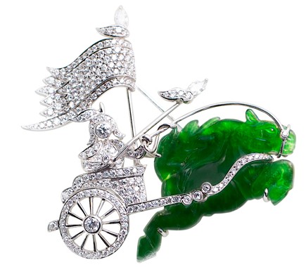 中國人認為馬是行走在地上的龍,陽綠色翡翠戰馬神采奕奕,抬起前蹄好似帶領千軍萬馬勇敢迎敵,由鉆石構成的騎士與戰旗輪廓分明、立體富動感,值得人們崇拜與愛護。