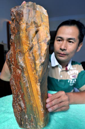 6月29日,福建省順昌縣奇石收藏者陳柏材展示在溪邊石灘上淘得的“四彩”珍稀寶石。這塊石頭長44厘米,寬10厘米,高18厘米,重25公斤,通體呈綠色、黃色、黑色和褐色,屬蛋白石類寶石,形成于900萬年前的燕山時期。位于閩江上游支流富屯溪流域的福建順昌縣出產的天然奇石以外形精巧、造型獨特、石質細膩、色彩斑斕而著稱,并因資源稀少而頗受國內奇石愛好者的青睞。