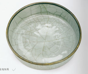 厘米,足徑12.3厘米。洗壁垂直微向外撇,平底,圈足寬而淺。通體灰青色釉,青翠如玉,釉汁肥厚凝重,釉面布滿了自然天成、縱橫交錯的開片。洗口部鑲銅口,圈足露胎呈褐色,紫口鐵足的特征十分明顯。洗內底印有一條蒼龍,其形象矯健勇猛,筆觸細微,但由于釉汁太厚,只有高光下才能顯現,更增添了“神龍見首不見尾”的神秘之感。此洗釉色純正,造型古樸、大方,為官窯典型器物,并且印有龍紋,較為罕見!吨袊沾砂l展史》一書記載過這種官窯洗,故宮博物院也收藏了這樣一件洗子,深受清代皇室喜愛,器底刻有乾隆御題詩,可見其珍貴。