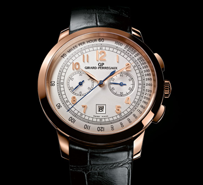 鍍銀表盤散發古典韻味,氣質永不過時,與GP1966系列的招牌風格緊扣,特別之處是6時位加裝了日期顯示功能;中置計時秒針,表盤外緣有測速計刻度,頂級計時技術水平不言而喻;3時位及9時位有兩個定時器,葉形時分針及鑲飾粉紅金阿拉伯數字精美講究,布局均衡,表盤空間充裕,給各功能各司其職,閱讀毫不費勁。
