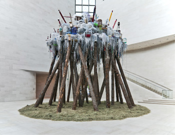 在惠特沃思藝術館展出的作品中,著名喀麥隆藝術家帕斯卡爾·馬丁·泰尤專門為本次藝術展創作的大型室內雨林作品《世界分崩離析》,將傳統非洲雕塑和象征物質財富的日常雜物有機組合,模糊了貿易商品同神圣事物之間的區別和邊界,體現了作者在世界經濟文化交流的背景下,對非洲社會、傳統文化和生活造成影響的思考與困惑。