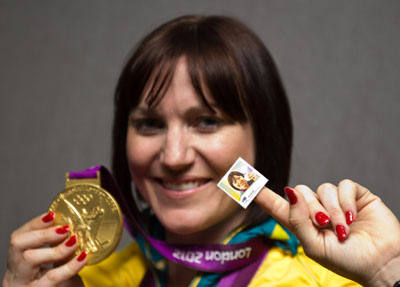 8月21日,在澳大利亞墨爾本市,2012年倫敦奧運會自行車女子爭先賽冠軍米爾斯(Anna Meares)正在展示印有自己頭像的紀念郵票。當日,澳大利亞郵政在墨爾本展示了為本國奧運冠軍發行的紀念郵票,該紀念郵票每張面值60分(約合人民幣4元)。新華社發