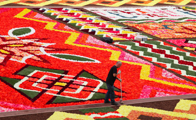 著名的比利時“鮮花地毯”日前再現首都布魯塞爾市中心的大廣場!磅r花地毯”面積1800平方米,由60萬朵鮮花鋪成,其中絕大部分是秋海棠,還有一部分大麗菊。