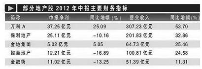 Wind資訊統計數據顯示,截至2012年8月25日,滬深兩市已有101家房地產上市公司公布了半年報,總體來看,上半年房企銷售普遍飄紅,但利潤增幅明顯落后于銷售增幅“招保萬金”四大行業巨頭上半年營業收入總額超過674億元,相比去年的484億元大幅增長近40%;但凈利潤只比去年同期增長不足2億元,為79.59億元。