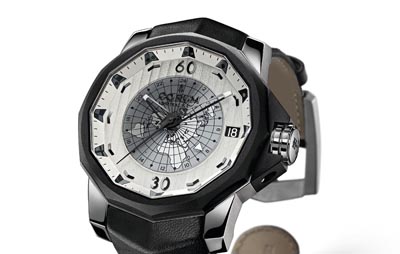 表面綴以日內瓦條紋,中央位置印上設24小時時區連格線的世界地圖,而地圖上方設一印有白色三角形標志的圓形透明旋轉盤。整個透明旋轉盤連白色三角形標志可透過表冠加以調較,而此白色三角形標志正正用以指示出第二時區的時間。當白色三角形標志調較至格林威治標準時間時,旋轉盤全透明的半邊正正顯示出世界那些地區現正是白天,而旋轉盤呈灰色的另外半邊則顯示出那些地區現為晚間時分。