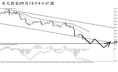 由于法院表示只要對ESM的出資額度不超過1900億歐元,政府無需通過下議院批準。從而為德國政府援助笨豬國家留下了廣大的空間,緩解了市場對歐洲債務危機的擔憂,也在短線上刺激了歐元走強。目前,歐元兌美元短線的漲勢強勁。而在非美全盤上行的態勢下,美元指數短線強力下挫,已經將4小時圖的下降通道刺破,下行空間被進一步打開。小時圖發生了角度明顯的MACD底背離信號,但由于下降趨勢線壓制作用完好,美元指數發生反彈的幅度料將有限。建議關注通道下沿79.80,預計美元指數有望向此位置發起一波回探,此后將繼續以下跌為主。