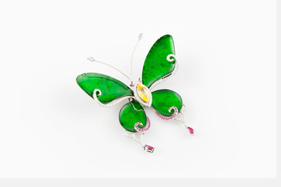 在清晨明亮的光線下,晶瑩的露珠在芳草上閃爍,更顯清新脫俗、嬌美可愛;翅膀閃耀著透明銀光的蝴蝶,在花間草葉上飛舞翩阡!熬G茵”系列透過精湛的切割技術與藝術設計,轉化為自然界中姿態曼妙的造物,呈現輕盈婉轉的線條;讓翡翠珠寶不只適于配戴,更成為現代藝術珍藏。