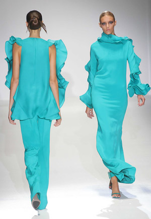 時裝周首日秀場上,古奇品牌2013春夏時尚女裝秀最為搶眼。本季新品保持了上一季流行熱點——注重色彩,大面積的玫紅、草綠、寶石藍,輔之以線條流暢的大花邊,褶皺,把女性的玲瓏線條勾勒得淋漓盡致,蛇紋、豹紋大幅回歸,但經過新設計,張揚中加入了優雅的元素。