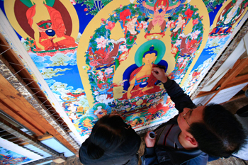 安靜的藏式小院里,桑斗合和他的兒女們仍在兩幅未完成的唐卡上專心地勾勒每個細節。院子的一角,桑斗合3歲的小外孫丹增多杰正有模有樣地拿著畫筆在自己的小畫板上涂抹著,專注的神情絲毫不遜于專心工作的舅舅和媽媽……也許,一名未來的藝術家正在這個唐卡之家幸福成長。