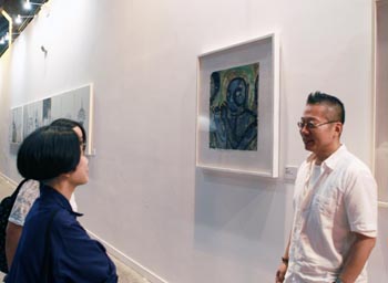 日前,由上海藝博畫廊等發起成立的“畫廊聯盟”,在上海紅坊文化藝術社區推出了“文化上海:朝向未來的回歸2012畫廊聯盟展”研討會活動。圖為一位參展的藝術家在與觀眾交流。資料照片 |