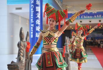 日前結束的東盟博覽會上,身著民族服裝的姑娘們敲響銅鼓迎接中外友人。記者周華/攝 |