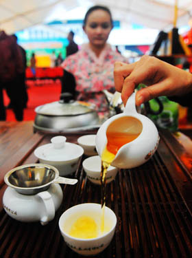在廣西靈山縣春茶節上,茶藝師現場泡制六堡茶給顧客品嘗。記者