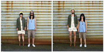 她回憶說:“我跟一些朋友去露營,其中兩個人的著裝風格迥異,一個人穿點綴亮片的扎染衣服,戴絲巾,著裝極富色彩,另一個人則穿著黑色牛仔褲和黑T恤衫。于是我們想到,這兩個人互換服裝會挺有趣,我決定在他們換裝前后拍下照片!