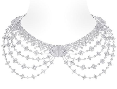 B?umer設計,再次以品牌尊崇的旅游藝術為出發點,將旅程概念超越地域所限,設計大膽創新,向古老的珠寶工藝及切割技術致敬之余,并散發濃厚婉約美態及時代感,每款設計都匯聚珠寶工藝精髓,不受時空及風格所限。路易威登兩款專利切割花卉造型鉆石與靈活柔軟精致網狀鏤絲,盡顯品牌珠寶工匠的專業造詣,黃金物料覆上藍色陶粉又見技術創新。最能代表品牌歷史及美學神韻的Monogram花卉以不同面貌亮相,變化多端更顯其豐富內涵深度。Voyage