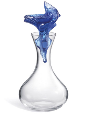 每一件Lalique的年度版酒瓶,均是收藏家引頸期盼的收藏品,2013年度珍藏版酒瓶——“沙漠之花”,酒瓶瓶塞上勾勒出一只淘氣的蜂鳥,在精致的沙漠之花中采集花蜜,悠閑自得。此情此景,正好是René Lalique最為喜愛的題材之一:動物與植物的融和。藍色的瓶塞非常適合配搭不同色澤的葡萄酒:由深紅至晶瑩剔透的澹黃,或是優雅高貴的玫瑰色調。清水晶的瓶身與以磨砂及拋光技術制作的瓶塞,表現了完美流暢的線條。