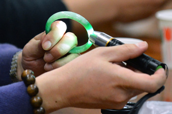 一位專家在為收藏愛好者鑒定玉器。記者