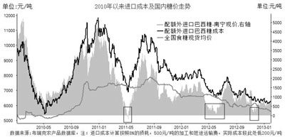 北京中期分析稱,盡管國內對進口食糖實施配額管理,但是一旦國內外食糖價差過于懸殊,即使按50%的配額外稅率進口也有利可圖,在2012年4至6月就曾持續出現過上述情況,結果造成進口糖數量大增,嚴重沖擊了國內食糖市場。