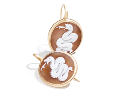 2013年正值中國蛇年,POMELLATO寶曼蘭朵Eva系列運用西方藝術中集繪畫和雕刻之大成的浮雕技法,在寶石上精雕細琢出中國十二生肖之一——蛇的玲瓏形象,以浮雕珠寶獻禮蛇年。神秘、靈氣、力量兼而有之的珠寶佳作躍動指間或蕩漾耳畔,極具新穎獨到之韻味。寶曼蘭朵的工匠們在尊重貝殼原狀的基礎上,在這些厚度僅為1至2毫米的原料上發揮純熟的手藝和才氣,雕刻出活靈活現的蛇。