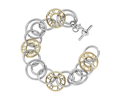 links系列手鏈趣味十足,大大小小的飾品相互交織,共同組成DKNY標志性LOGO。這些飾品隨意組合,形成自然的層次感與多維的兩種色調:鍍金色和銀色,閃閃發光,極具吸引力。
